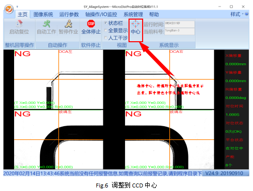 软件上点击中心,在图像中可以看到橙色的十字线,这个为视野中心,在产品上料过程中,我们需要将产品放置到橙色十字交点即视野中心位置。