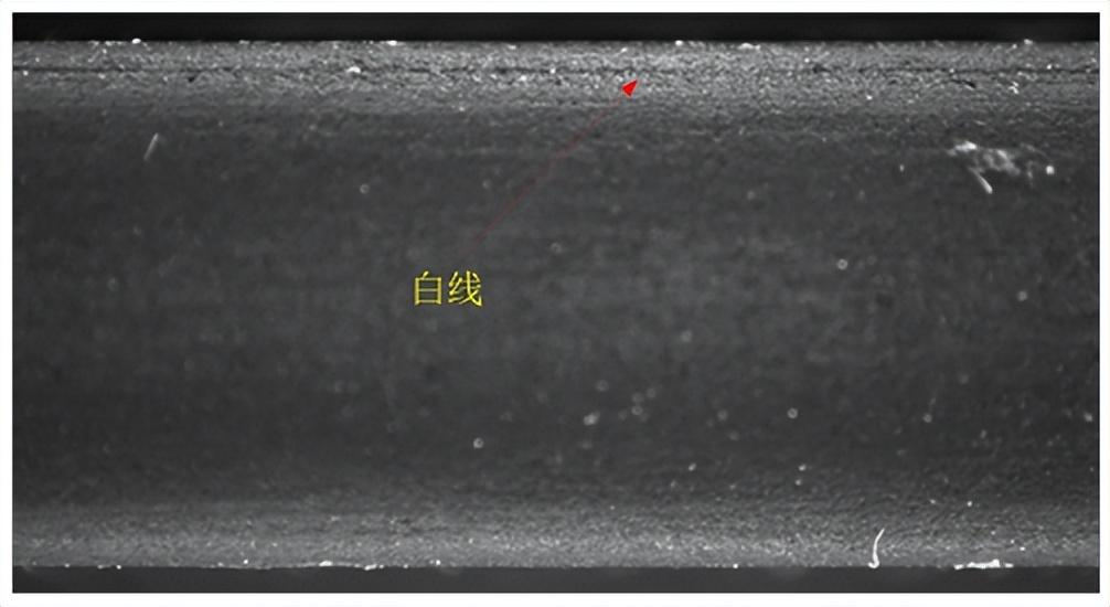 白线方向与水平轴基本平行,宽度小于等于0.1mm,长度大于等于4.25mm即为白线,其位置可出现在玻璃边部的任何位置。在磨削加工过程中,砂轮上的磨粒脱落导致硬质点分布不均或脆性断裂产生的玻璃碎渣极易划伤表面,由于水平方向上有一定的线速度,因此会在表面留下一条细长的划痕(刚产生的白线会粘有玻璃碎屑)