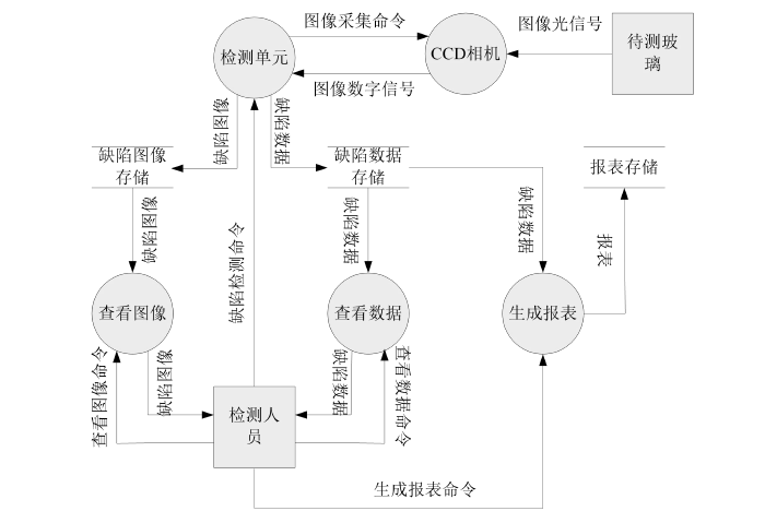 待测物体将图像的光信号传递给相机,相机将光信号转换为数字信号传递到图像的缺陷检测中心进行缺陷检测;检测中心将带有缺陷的图像传递到图像缺陷存储中,同时将缺陷的特征数据(包括位置、大小、类型、数量、发现时间等)传入缺陷数据存储;检测中心还可以接收检测人员下发的图像采集指令,同时传递給CCD相机。查看图像处理接收到检测人员发出的查看图像指令,从缺陷图像存储中检索出带查看图像呈现给检测人员。查看数据处理接收到检测人员的查看缺陷数据指令,从缺陷数据存储中检索出缺陷数据,传递给检测人员查看。生成报表处理接收到检测人员发出的生成报表指令,从缺陷数据存储中检测出缺陷数据处理后生成报表存储到报表存储文件。