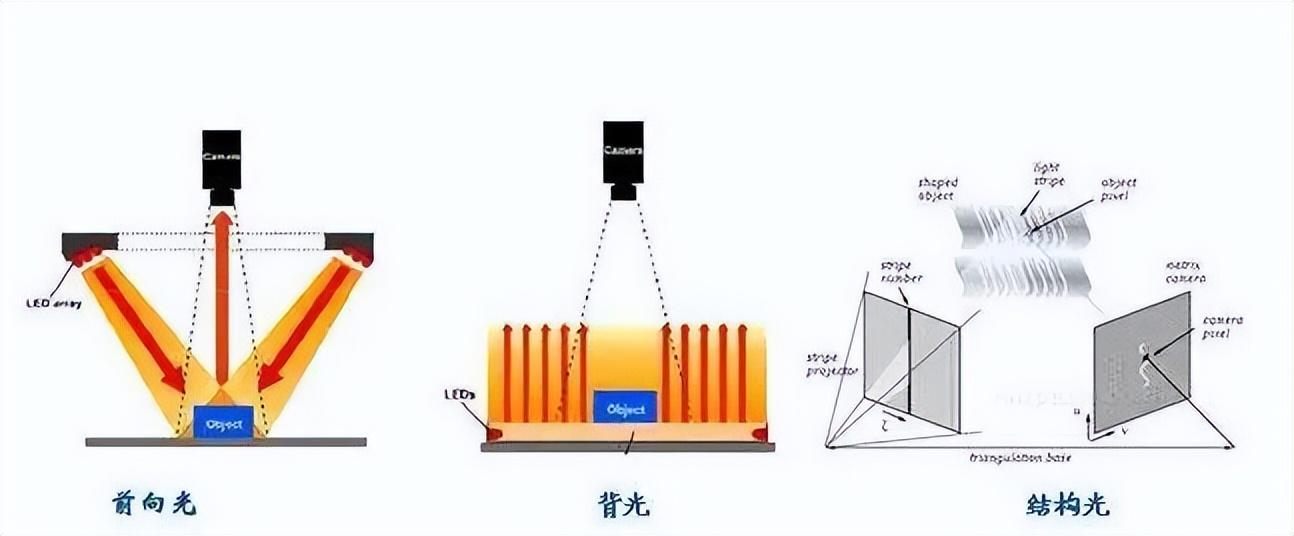由光源构成的照明系统按其照射方法可分为明场照明与暗场照明、结构光照明与频闪光照明。明场与暗场主要描述相机与光源的位置关系,明场照明指相机直接接收光源在目标上的反射光,一般相机与光源异侧分布,这种方式便于安装;暗场照明指相机间接接收光源在目标上的散射光,一般相机与光源同侧分布,它的优点是能获得高对比度的图像。结构光照明是将光栅或线光源等投射到被测物上,根据它们产生的畸变,解调出被测物的3维信息。频闪光照明是将高频率的光脉冲照射到物体上,摄像机拍摄要求与光源同步。