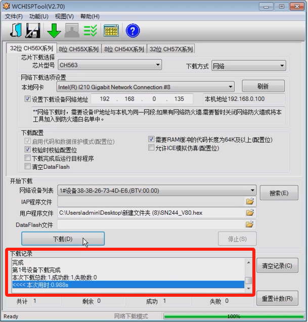 观察下载记录窗口,可以看到设备下载完成,表示升级完成。