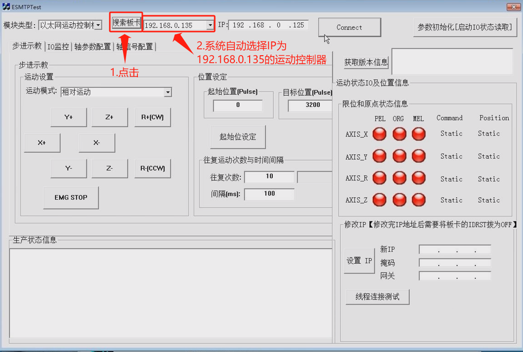 点击搜索,程序自动选择IP为192.168.0.135的运动控制器(实际操作时候可能会因为现场情况,IP会有细微不同)