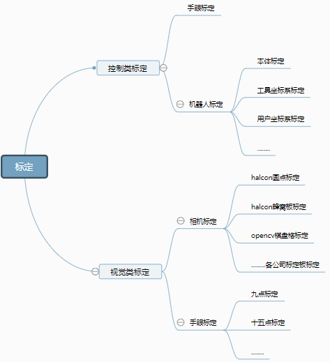 标定的基本原理是建立多个坐标系之间的转换关系,从而求解出需要的坐标系坐标,将空间内物体或者工件统一在一个坐标系下,便于后面的工作开展。接下来,我通过一个思维导图来说明: