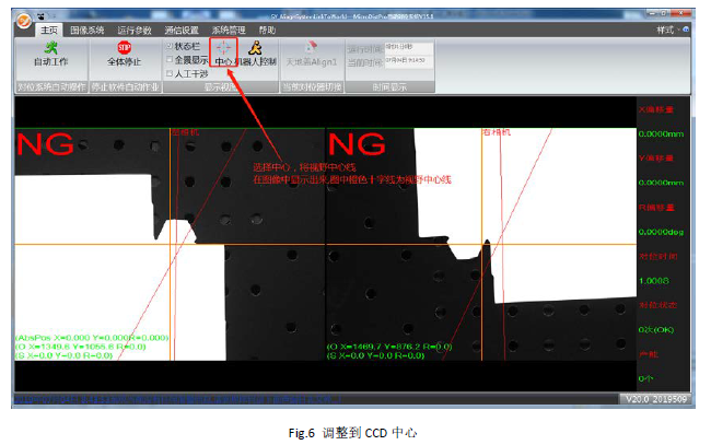 软件上点击中心,在图像中可以看到橙色的十字线,这个为视野中心,在面纸上料过程中,我们需要将面纸的特征点放置到橙色十字交点即视野中心位置。