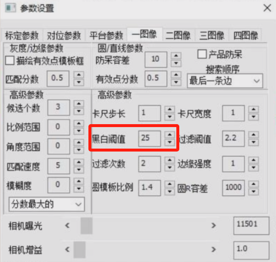 黑白阈值:高于此值的像素变化率峰值(或谷值)才被考虑过渡点;(参考设置值:20-30)