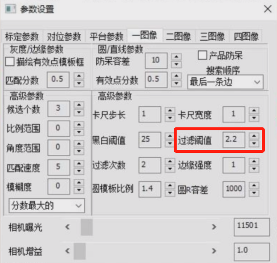 过滤阈值:该值的倒数即为所有边缘点到拟合出的直线的平均距离。到拟合直线距离大于该平均距离的点即为差异点;(参考设置值:2.0-2.5)