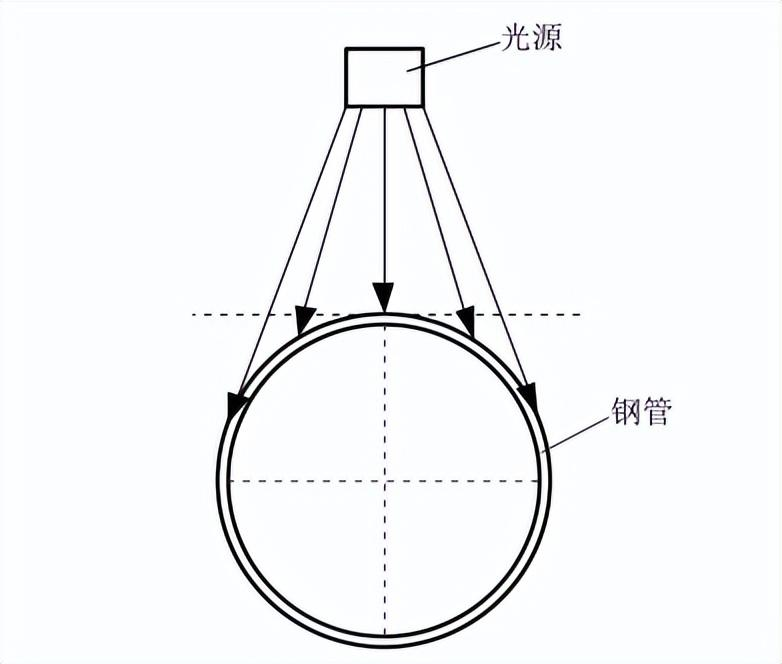 对于钢管而言,因其几何结构特点,当采用面阵光源时,弧形外表面使得光源中心与被照射区域各处之间距离相差过大,如图所示,与光源最短距离位置处表现为较高亮度,而在最短距离位置两测,光照亮度分布减弱,图像成像结果也表现类似特点,中间区域像素灰度分布较高而两侧区域像素灰度值较小。