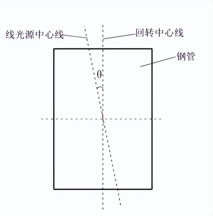 另一情况如图所示,采用线阵相机和线阵光源实现钢管表面缺陷动态检测时,因振动、装配误差等因素,线阵光源中心线与线阵相机视野长度方向并非位于同一直线,相机视野方向通常与钢管回转中心所在直线一致;这种情况会降低照射区域与视野区域重合性,导致成像结果光照不均现象严重,进一步增加图像处理的困难度。