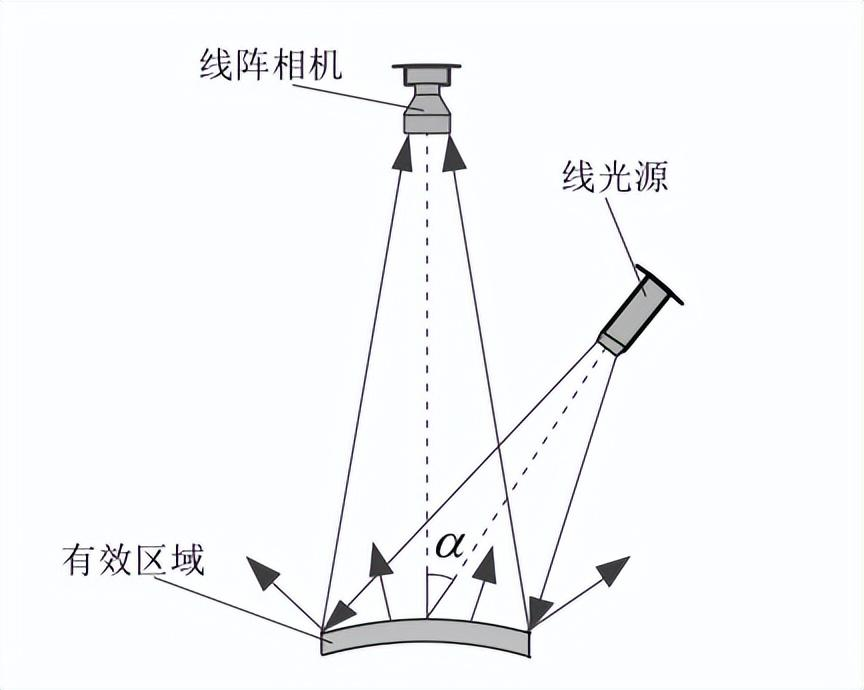 钢管表面的照明方式可分为明场照明和暗场照明,本文选择明场照明方式,该方式有益于钢管表面缺陷和背景形成高对比度。由于采用单个线阵相机和线光源,其有效工作区为窄条,与其它冶金产品表面不同的是,热轧无缝钢管在成型过程中,因其工序工艺的特点,表面未经抛光处理,光照反射类型以漫反射为主。图为明场照明光路结构图。