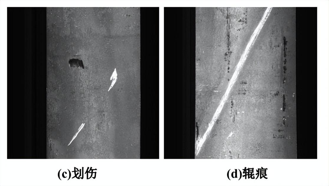 图(d)为辊痕缺陷,该缺陷是由于轧辊调整不当或表面损坏所造成,呈周期性或连续性分布。