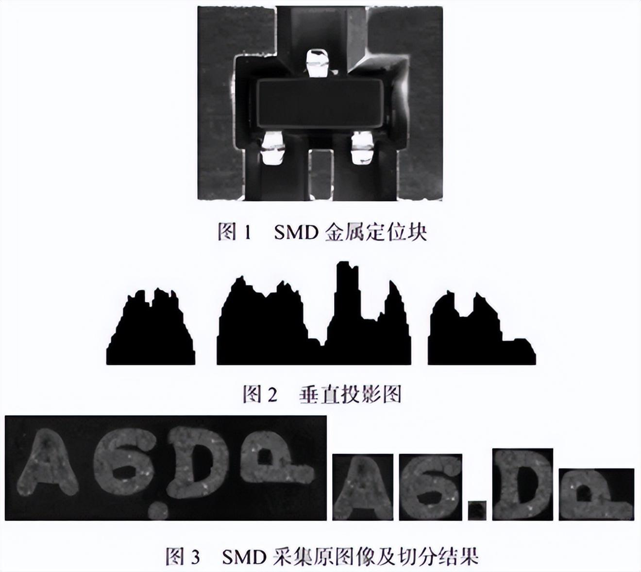 在进行字符分割之前,要进行SMD芯片的位姿矫正。SMD的欧式运动是先旋转、后平移的组合,所以可以用刚体运动来表示位姿。利用二值化图像的像素分布直方图进行分析,从而找出相邻字符的分界点进行分割。在利用垂直投影切分的方式进行字符切割的结果,如下图所示。