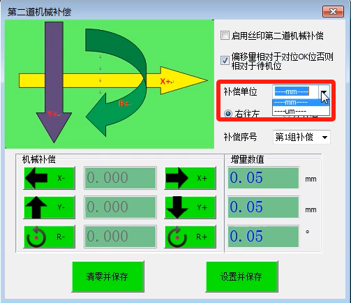 补偿单位:点击可看到有mm毫米与um微米两个单位可供选择,根据需要可以自行进行选择,所选的补偿单位便是进行机械补偿的增量数值的单位。