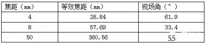 以下列举几个实例:长焦距镜头视场角窄于40°,例如:镜头焦距2.5 mm,视场角为 45°左右。镜头焦距5.0 mm,视场角为 23°左右。镜头焦距7.5 mm,视场角为 14°左右。镜头焦距10 mm,视场角为 12°左右。镜头焦距15 mm,视场角为 8°左右。