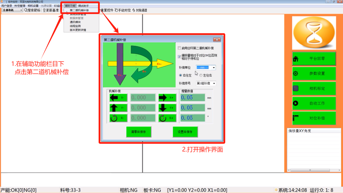 在主界面上侧菜单,找到辅助功能功能栏下的第二道机械补偿,点击打开