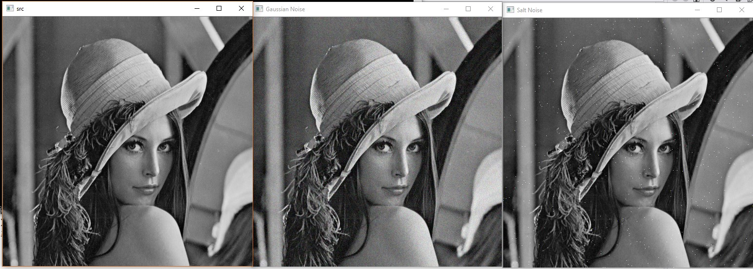 使用C++的随机数发生器为图像添加两种噪声:椒盐噪声和高斯噪声。