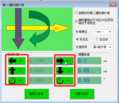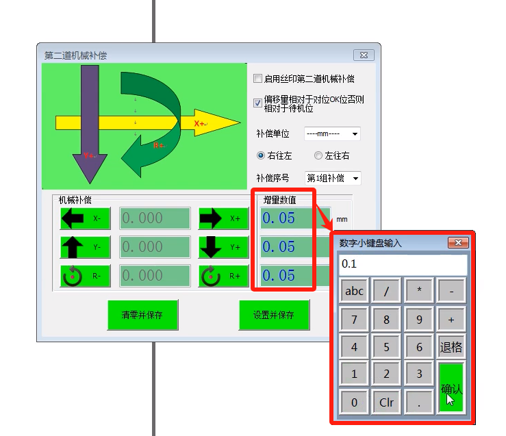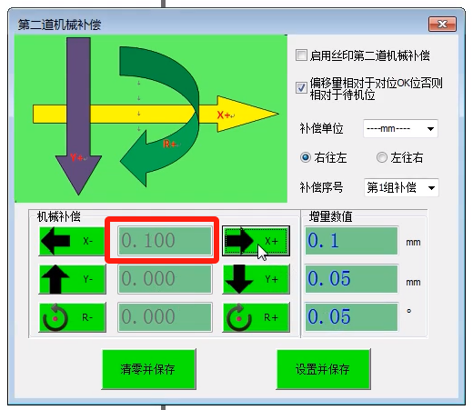 点击左侧机械补偿的 XYR 补偿按钮,单击一次按钮以右侧“增量 数值”递增或者递减
