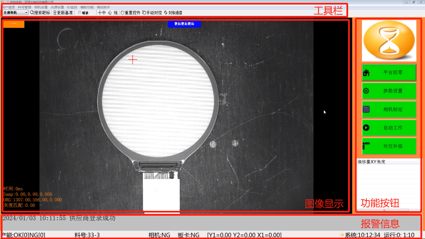首先,在杏耀平台登录入口对位系统的根目录下,找到名称为WiseAlign.exe的运行程序,双击该应用程序图标,进入运行程序,主界面主要分4个区域(左上角:工具栏;右侧:功能按钮;中间:图像显示;下侧:报警信息)