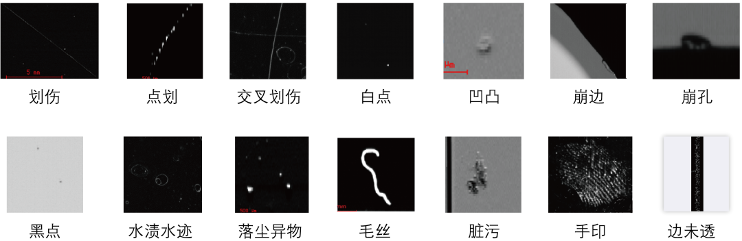 2、采用线阵相机将产品架设在运动平台上,进行玻璃的质量检测,判断表面是否有异物\划伤、异色、凸包、凹痕、针孔、毛边、亮点等缺陷。