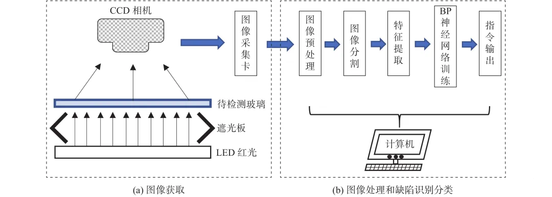 基于机器视觉技术的玻璃质量检测流程:产品经过光学系统,LED红光垂直(或其他角度)入射待检测玻璃后,若玻璃中存在缺陷,CCD相机的靶面检测到不均匀的出射光,然后图像采集卡对输出的信号进行实时采集并将数字化处理后的图像传输至计算机中,依靠视觉检测软件系统完成缺陷图像的滤波、边缘检测、特征提取以及分类的功能,最终达到玻璃智能检测的目的。