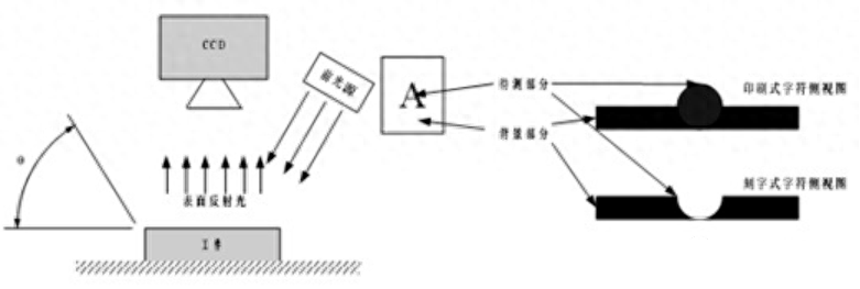 在检测轮盘上的字符时,鉴于文字是刻在涂层表面上,采用低角度照明法,采集的图片中原本凹陷入轮盘里的字符与背景形成了鲜明的对比,十分易于后续图像处理。