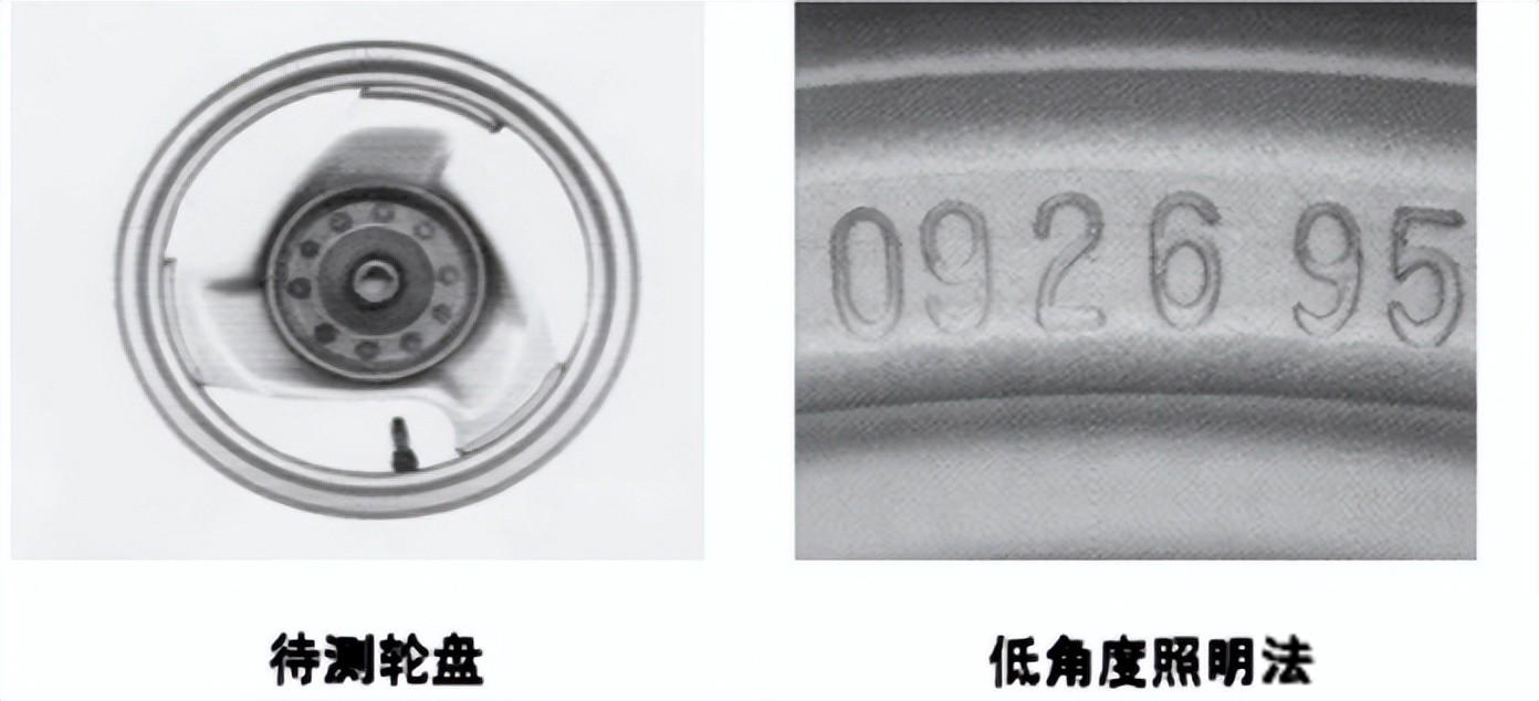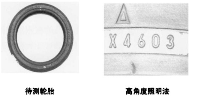 轮胎上的数字编号凸出于轮胎侧表面,且与背景颜色相同,因此很难判别。但是采用前光源高角度照明法可以在相片上产生微妙的“凸出”效果,数字编号可清晰的浮现出来。