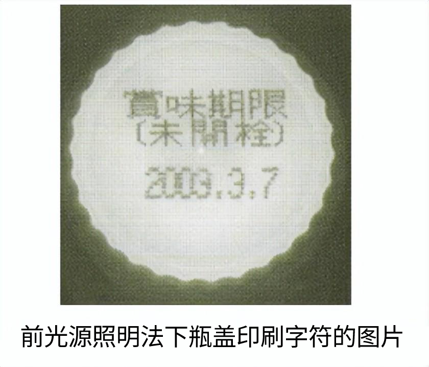 在检测生产线上黄油瓶盖上的点式印刷字符是否合格时,通过采用合适的前光源技术,拍摄图像中点阵字符的每个点都清晰可见。