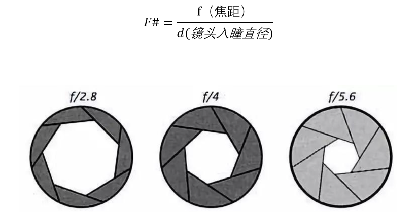 镜头的光圈调节环标记的数字如:16、8、5.6、4、2.8等不同的数值,这些参数表征了镜头的通光能力。从下面的公式可以看到,当一枚镜头的f焦距固定,F#越小,镜头入瞳直径(通光孔径)越大,进而通光量更大,反映到图像上其亮度也会提升
