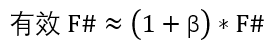 有效F#,此数值为镜头在有限距离内的实际光圈数,决定了实际操作时的亮度。光学放大倍率B越大,则镜头成像越暗。