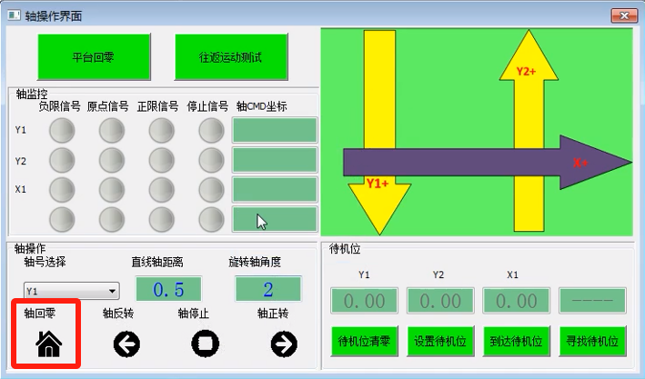 4. 轴回零:在“轴号选择”选择当前想操作的轴序号,该轴机械回零点;