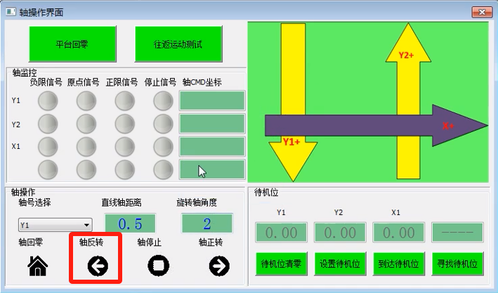5. 轴反转:在“轴号选择”选择当前想操作的轴序号,根据设置的“直线轴距离”值发送正脉冲控制轴运动一段距离;