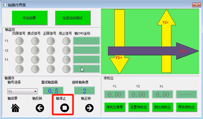 6. 轴停止:在“轴号选择”选择当前想操作的轴序号,停止该轴运动;