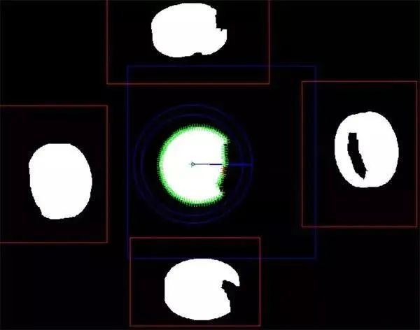 首先,使用视觉软件中的图像操作,对图像进行绝对差值运算,提升药片边缘与缺陷对比度,再利用击中或不击中运算,将缺损及边缘对比进一步扩大并突显出来,再通过二值化提取出明显特征。最后使用崩边检测,来计算边缘缺损的辐散程度,可辨别出药片正面是否存在缺损,最终效果如图5所示。