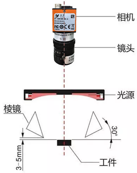 因需检测药片所有表面,实验中采用棱镜模组进行配合打光,通过分次曝光来分别检测正面与侧面的缺陷,从而获取药片360°全方位的图像信息。(如图2,3所示)