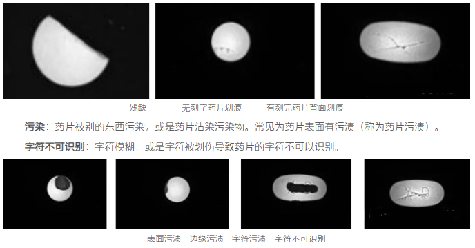 完整性:药片残缺、不完整。常见为药片碎片、药片四周划伤(称为药片周围划伤)。