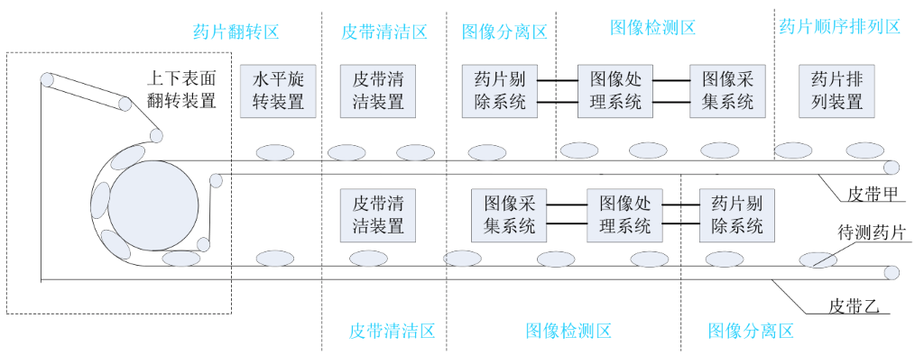 如图上图所示,药片在传送带甲上由右向左运行,首先将待检测的药片装入料斗,经过药片排列装置将药片排成一列,随皮带甲移动;当药片进入图像采集装置的视野范围时,触发图像采集装置,采集药片图像;将采集的药片图像传输到图像处理装置,对采集的药片图像进行分析处理,判别药片是否有缺陷;将不合格药片采用剔除装置将其分别装入到相应的废品收集器中;由于长期传送药片,传送带上残留太多药片灰尘时,启用清洁装置,及时清洁传送带;在传送带甲上,仅采集到了药片一个表面的图像信息(此处我们称作药片上表面信息),通过翻滚型的药片翻转装置,翻转药片的上下表面,在传送带乙上,采用图像采集装置采集药片下表面图像信息,然后使用图像处理装置分析处理药片图像,并及时将不合格药片剔除。