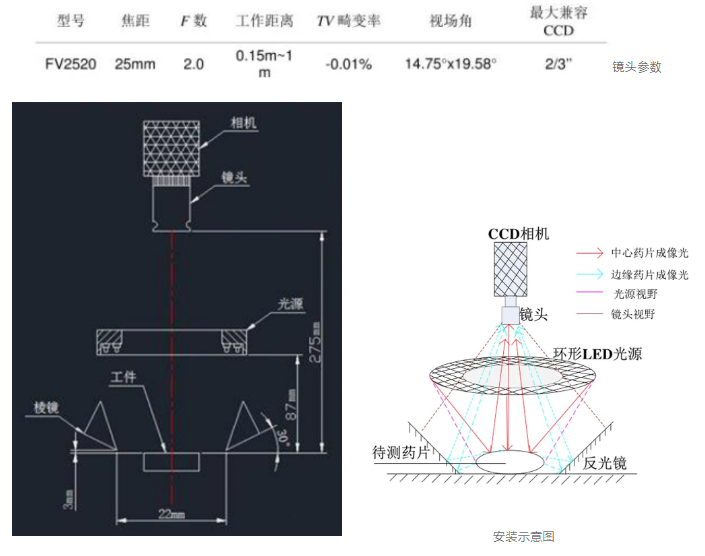 划痕、字符等信息,相对于药片表面来说,景深差距较小,因此相机的灵敏度是本系统首要考虑的因素。其次,为了便于后续图像的分析处理,本系统应该选择噪声点较小相机。最后,实时性好和精度高是本药片检测系统的首要要求,因此从速度和分辨率角度分析,1200万像素的CCD面阵相机依然是本系统的最优选择。