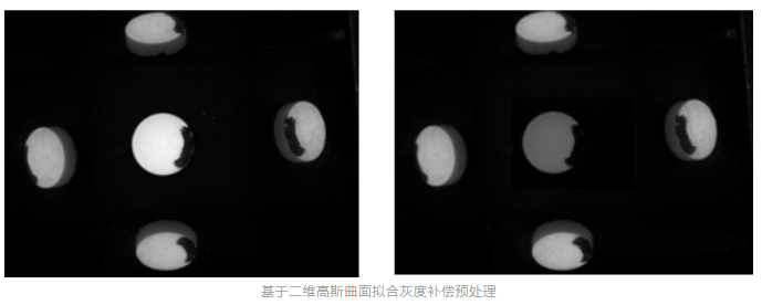 图像灰度不均衡:药品表面是一个曲度,通过反光成像获取的边缘药片的光强度信息较低,所以边缘药片的灰度值会明显低于中心药片的灰度值。通过基于二维高斯曲面拟合灰度补偿预处理算法,对图像灰度进行修正。