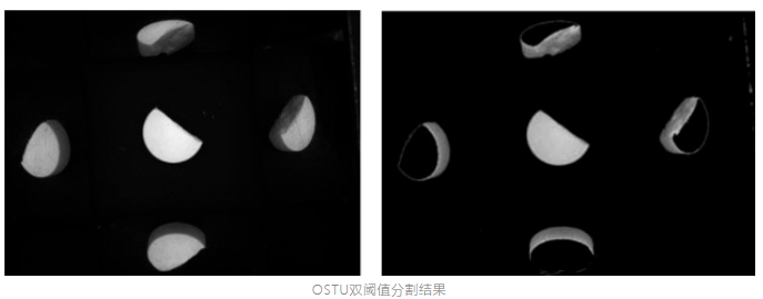 冗余信息过多:为了准确地提取药片缺陷特征,需要从药片图像中分离出药片信息,其中要求得到的药片信息包含药片缺陷可能存在的任何区域,同时尽可能地减少药片信息的冗余。采用OSTU双边阈值分割法对药片图像进行预分割。