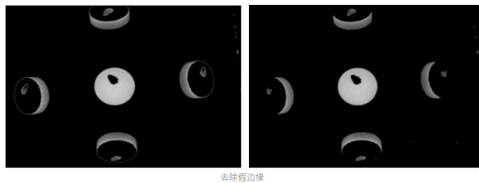 图像边缘修正:经过OSTU双阈值处理后,可以准确分离出药片信息,包括药片上表面信息和药片侧面边缘信息。与此同时,药片图像的边缘药片处出现了假边缘,通过形态学方法去除图像的假边缘。