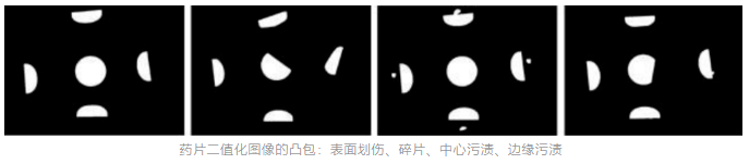 凸包(ConvexHull)是一个图形学概念。给定二维平面上的点集,凸包就是将最外层的点连接起来构成的凸多边形,它能包含点集中所有点的。如下图,药片表面划伤图像和药片中心污点图像二值化后经凸包运算,其中心药片和标准药片相同,对于药片碎片和药片边缘污点图像,其中心药片的面积小于合格药片。