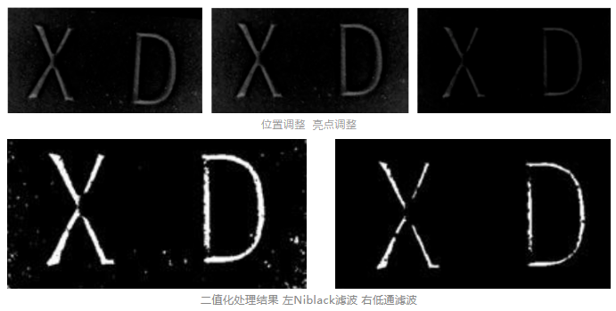 因为药片是随机放置的,所以需要对采集图像上的字符进行调整。经过掩膜法提取药片字符区域,经过亮度调整后,字符的噪声减少了很多。现通过二值法提取字符特征。最后再通过二值法提取字符特征。