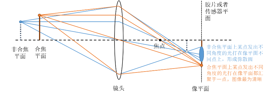 理解景深原理前,我们必须明白一件事:当我们对焦时,其实只有一个平面是真正合焦的。这个平面与像平面(可以简单理解为胶片或者传感器平面)平行。凡是在这个平面之前或者之后的都不是合焦状态。合焦平面上物体某点发出不同角度的光在像平面成像都汇聚于一点,而非合焦物体的某点发出不同角度的光会落在像平面不同点上,形成一个模糊圆,这个圆术语叫做弥散圆(circle of confusion)。