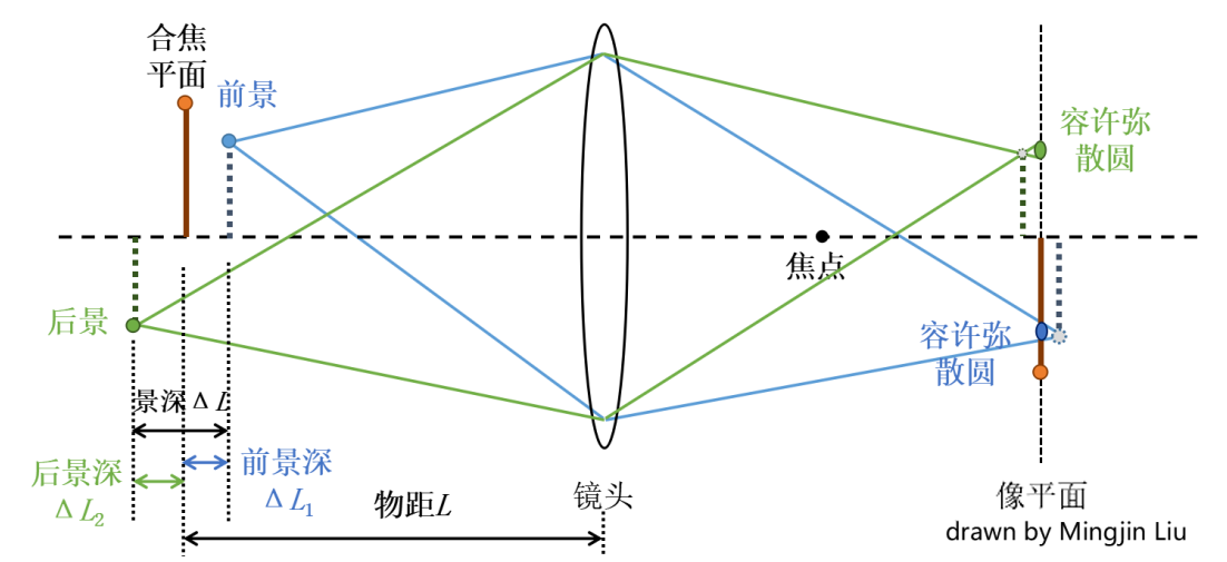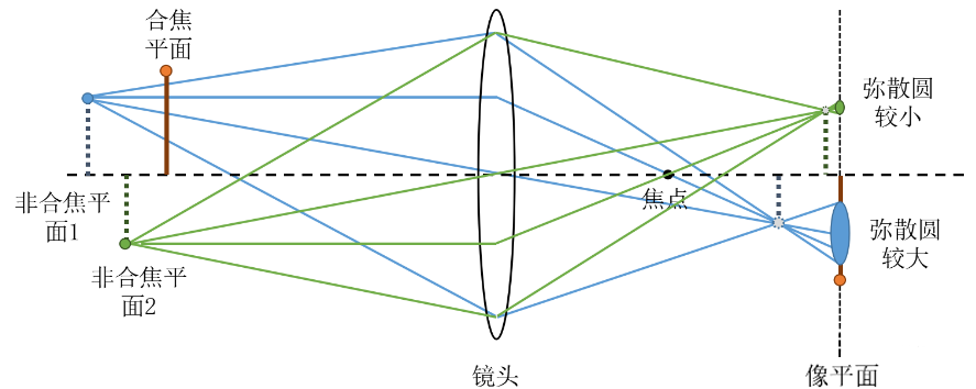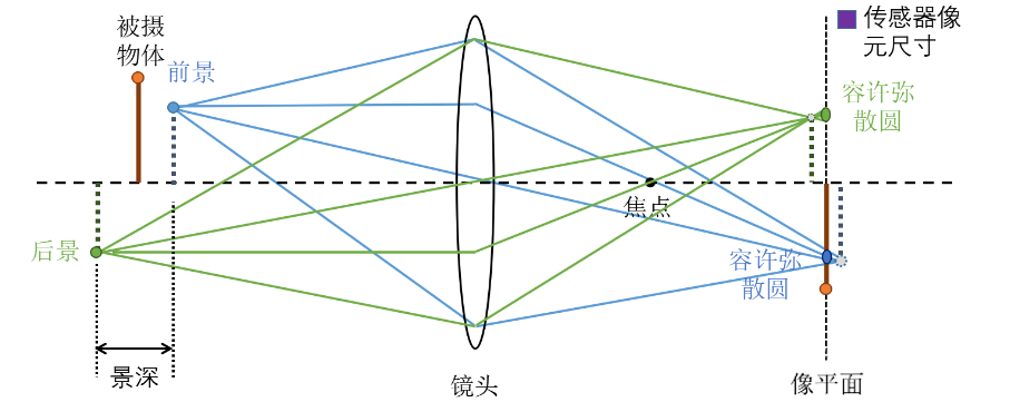 如果弥散圆小到人眼无法鉴别(或者说弥散圆直径小于传感器像元的大小),模糊圆可被视为点的成像,看起来就和对上焦的东西一样清晰,此无法分辨的弥散圆称为容许弥散圆(permission circle of confusion)。在被摄物体(对焦点或合焦平面)前后纵深,有一段距离,其影像在像平面的模糊程度肉眼无法分辨,比较清晰,都在容许弥散圆限定范围内,它们之间距离称为景深。