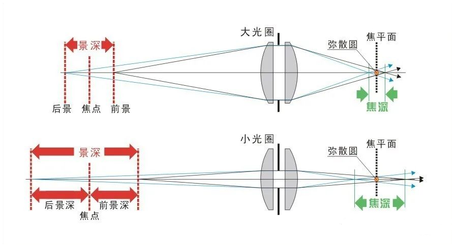 镜头光圈:光圈越大,景深越小;光圈越小,景深越大;