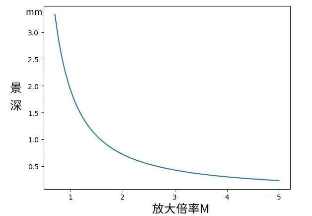 景深受放大倍率影响较大,随着放大倍率增大快速降低: