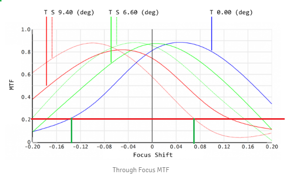 图上图,MTF大于0.2(清晰度可接受),-0.14到+0.07,焦深 0.14+0.07 = 0.21。备注:实际上,这里得到的是焦深,焦深跟景深有对应关系,得到了焦深,也就得到了景深。