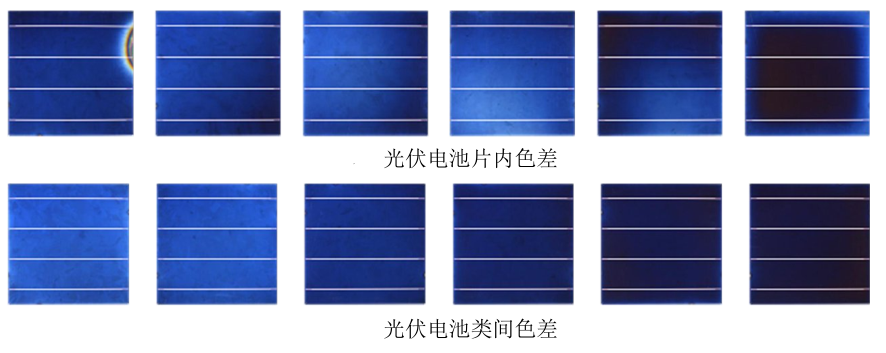 在光伏电池行业, 色差指的是同一光伏电池表面的颜色分布不均匀。色差检测是指对同一光伏电池表面进行颜色分布均匀性的检测。其色差检测算法的优劣直接影响下一生产环节-组件产品质量控制。