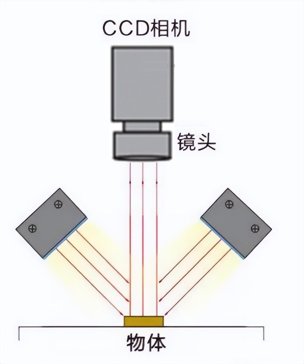 光线方向与检测面相对接近平行,表面平整部位相对无反射光线进入镜头之中,在画面中显示偏暗不平整的部位,如凹坑、划伤等表面结构复杂,反光较为杂乱,只有较少部分光线可以折射到镜头中,在画面中表现较亮。