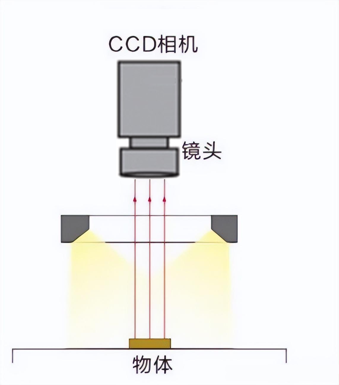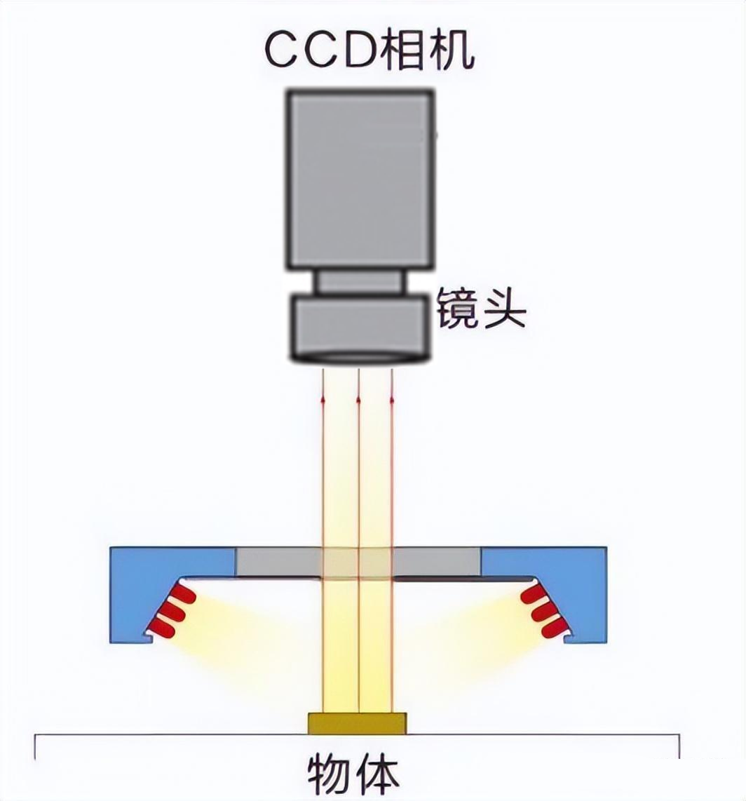 光线方向与检测面相对垂直,表面平整部位反光相对容易进入镜头之中,在画面中显示偏亮。不平整部位如凹坑、划伤等表面结构较为复杂的情况,反光较为杂乱,只有较少部分光线可以折射到镜头中,因此画面中效果会偏暗。