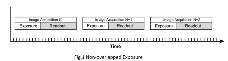 关于图像采集过程中,相机操作有两种常见的方法:“non-overlapped”的曝光和“overlapped”的曝光。在非重叠(“non-overlapped”)模式中,每个图像采集的周期中,相机在下一个图像采集开始前,均要完成曝光/读出整个过程。如Fig.1所示。